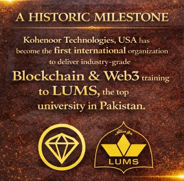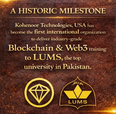 Official Newsfeed: Kohenoor Technologies USA, under the umbrella of Knowledge Gateway Pakistan, delivered the first-ever industry-grade training on Blockchain, DeFi, and Web3 to the Finance Department of Lahore University of Management Sciences (LUMS) from 19th to 23rd January, 2026, at LUMS Main Campus (DHA).