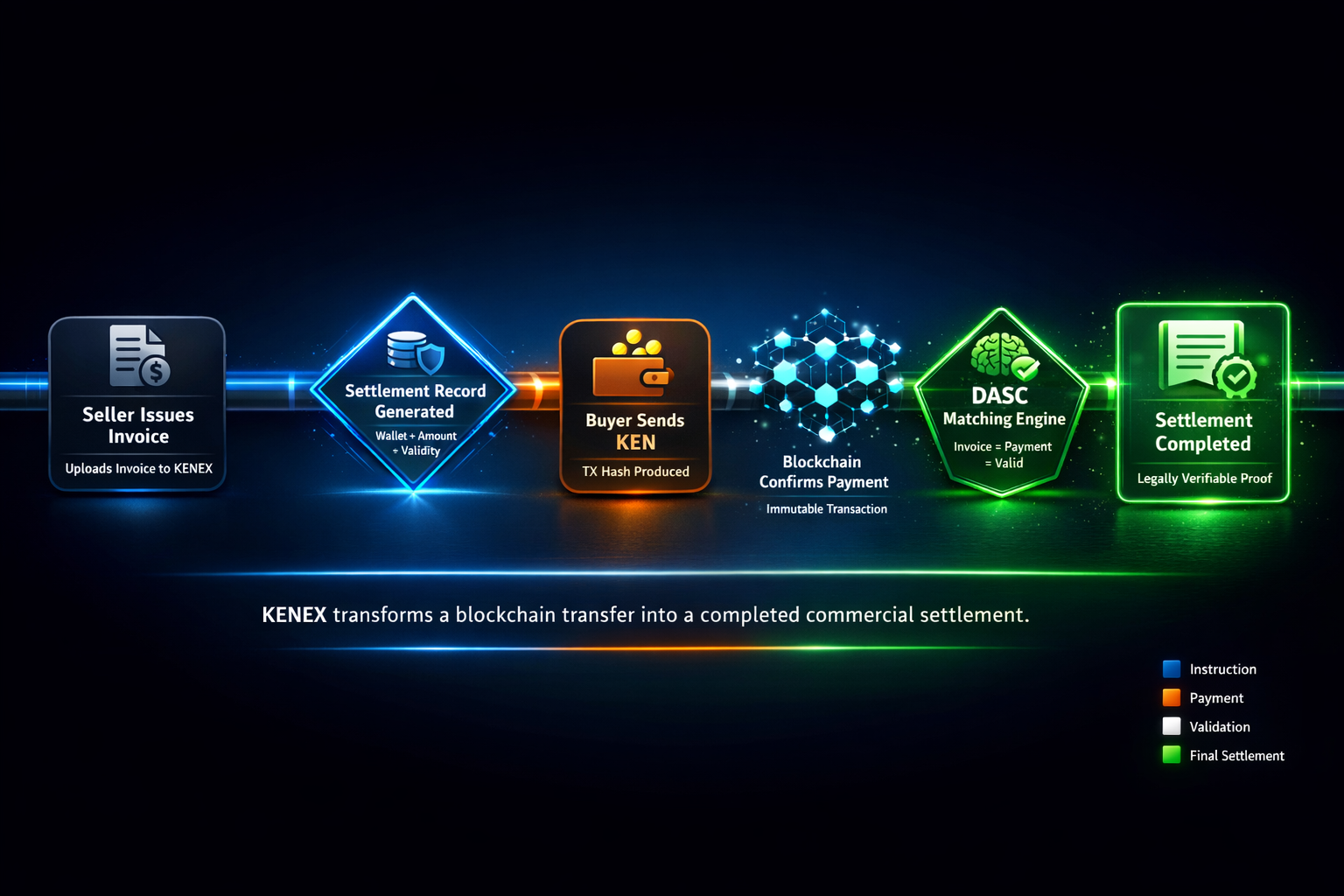DASC acts as the transaction clearing layer — recording, verifying, and finalizing payments on-chain while KENEX coordinates off-chain documentation and compliance checks. This enables programmable invoices, settlement references, and verifiable transaction records for accounting and audit purposes.