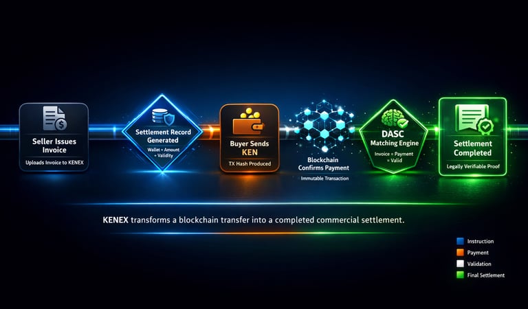 While most blockchains only transfer value, KENEX completes the financial obligation behind the transfer. Businesses can send funds internationally, settle invoices, and receive a verifiable settlement certificate — all within a single workflow. It combines liquidity movement, escrow-style settlement, and proof of execution into one digital rail, reducing reliance on correspondent banks, delayed reconciliations, and manual audit processes.
